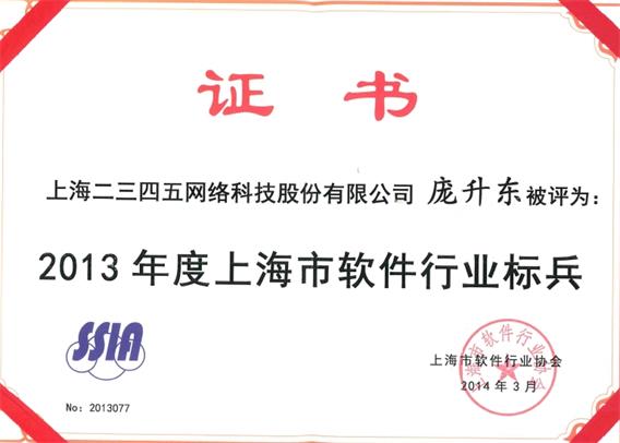 2014年3月26日下午,上海市軟件行業協會2014年工作年會暨“上海市軟件行業標兵&軟件行業服務明星”評選活動頒獎典禮在上海市經濟管理干部學院禮堂舉行。上海市經信委、科委、發改委、商務委等相關部門負責人,相關產業園區(基地)、行業協會、軟件企業負責人及十余家媒體記者,約300人到會。本次評選活動中二三四五董事長龐升東獲得軟件行業標兵稱號,二三四五軟件研發中心李春志獲得軟件服務明星稱號。