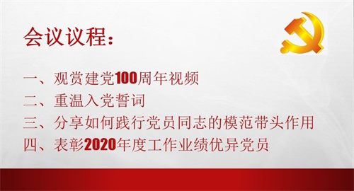 會議開始,黨員們觀看了建黨100周年視頻,跟著視頻回顧了黨建立百年以來的光輝歷程,不忘歷史,展望未來。之后,在黃國敏書記的帶領(lǐng)下,所有參會黨員重溫了入黨誓詞,再一次明確了自己的責(zé)任和使命,堅定了作為共產(chǎn)黨員的理想信念。